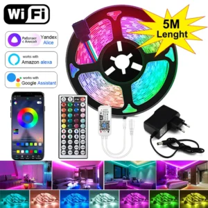 RGB LED Strip Light para quarto, tiras de controle inteligentes, 5050, WiFi, Alexa, 12V, 5m, 44Key