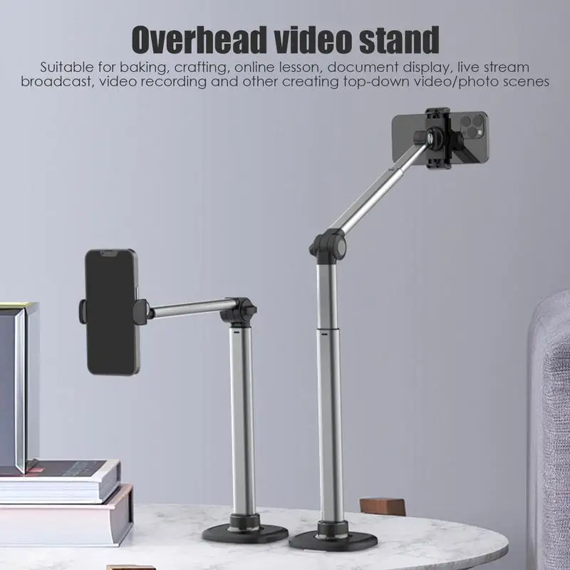 Overhead tripé telefone montagem, 360 graus de rotação, alumínio desktop stand para vlogging, fotografia, on-line